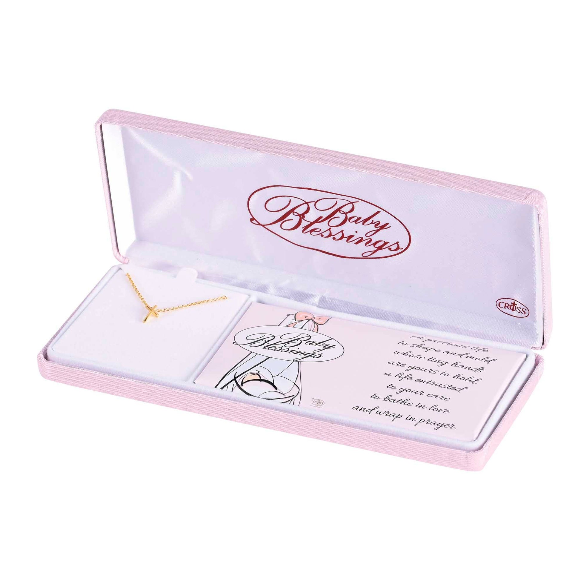 Gold-Plated Box Cross Measuring 3/8 Inch Hangs On 13 Inch Oval Link Chain With Spring Ring Clasp And Makes A Wonderful Gift For A Baby Girl. Packed In A Light Pink Hinged Gift-Box With Insert That Reads: A Precious Life To Shape And Mold Whose Tiny Hands Are Yours To Hold; A Life Entrusted To Your Care To Bathe In Love And Wrap In Prayer. Verse By Alda Maria Copyright Dicksons.